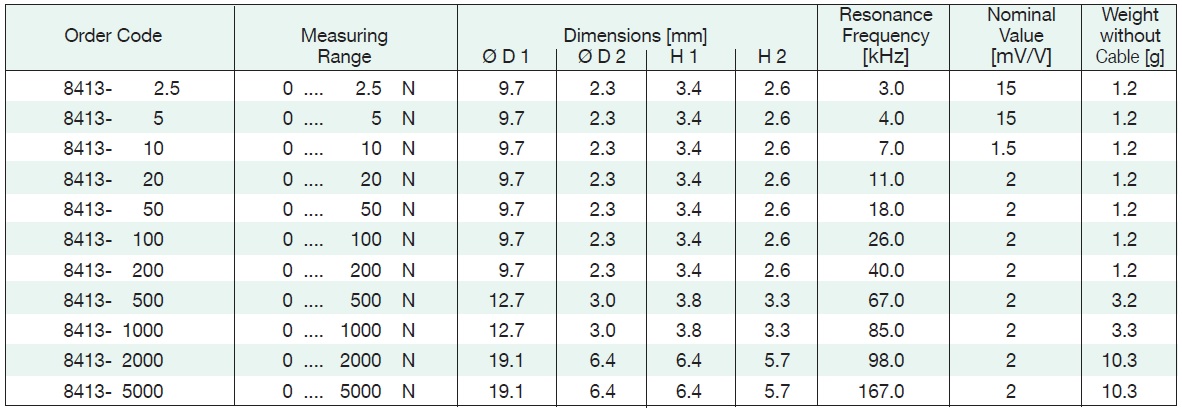 The Burster sub-miniature compression load cells are flat, cylindrical with covered bottoms. The load application button for receiving the compression forces is an integrated part of the top, which is the sensor's membrane. The strain gauges are applied on the back and wired to a full Wheat-stone bridge, which results in voltage output proportional to the load applied. The connecting cable of the load cell features a covered correction network on a small board. The sensor's temperature compensation is installed here. Due to its extremely small dimensions, this model is perfect for use in applications with limited space. The small diameters result in high resonance frequencies.