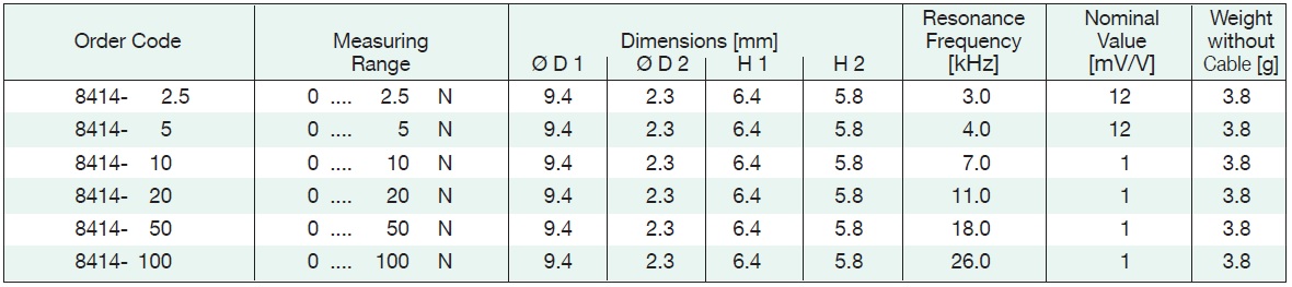 cells are flat, cylindrical with covered bottoms. The load application button for receiving the compression forces is an integrated part of the top, which is the sensor's membrane. The strain gauges are applied on the back and wired to a full Wheat-stone bridge, which results in voltage output proportional to the load applied. The connecting cable of the load cell features a covered correction network on a small board. The sensor's temperature compensation is installed here. Due to its extremely small dimensions, this model is perfect for use in applications with limited space. The small diameters result in high resonance frequencies.