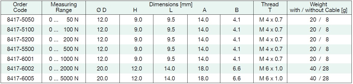 The Burster Load cell model 8417 measures the tension or compression force between both axially mounted metric exterior threads on the cylindrical sensor housing. Forces are only applied to the threading, which accommodate counter nuts and must not be affected by external influences such as bending, lateral force or torsion. Any contact with units affixed to the sensor housing - even on the front - must be avoided.The measurement element is a membrane perpendicular to the axis of the sensor with a strain gauge full bridge applied to the inner surface, which requires stable excitation with a rated value of approx. 1.2 mV/V. The connection cable is fed radially through a sleeve from the housing. Standardization of the output signal in the cable to 1.0 mV/V is optional.