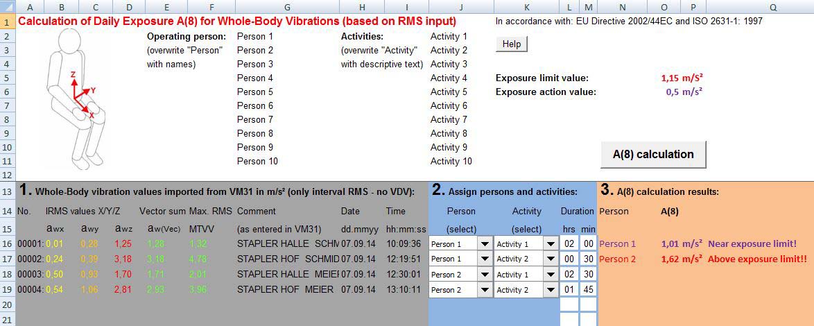 - Results are stored in a calculation sheet for the daily exposure A(8) which may include several activities, with Excel export function