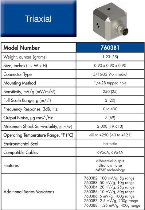 The Dytran 7603B is a high precision triaxial variable capacitance (VC) accelerometer, designed to be used as a drop-in replacement for piezoresistive units in new or existing zero-to-medium frequency instrumentation applications.