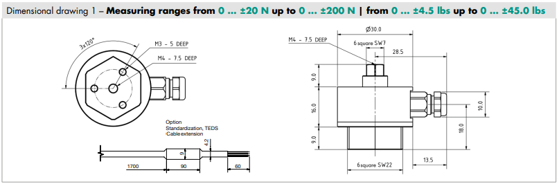 It has radial connection cable which is extremely flexible and designed for a wide range of motion. The measurement element is a membrane perpendicular to the axis of the sensor with a strain gage full bridge applied to the inner surface, which requires stable excitation with a rated value of approx. 1mV/V.