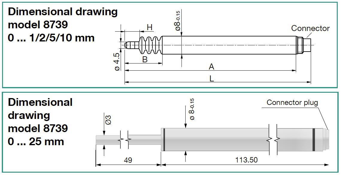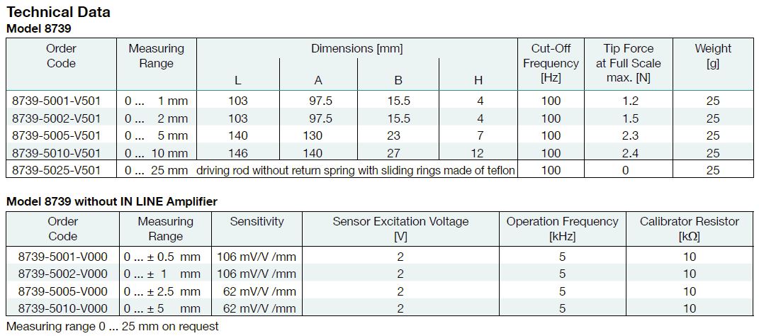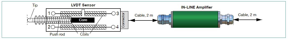 The cylindrical case made of stainless steel, houses a differential transformer (LVDT). It consists of a primary and two secondary coils with axially moveable core. A displacement of this core changes the magnetic induction of the coils. The IN-LINE carrier frequency amplifier converts the displacement into a direct proportional electrical DC voltage.
