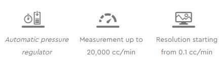 With standard flow valves, it's ideal for testing volumes up to 10 liters. Low maintenance, stable and noise free. A special "flow sensor deviation" parameter allows a continuous comparison of the two sensors of flow measurement(can be excluded by setting the threshold to 0%).