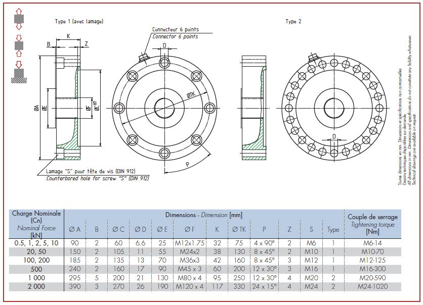Stainless steel force sensor with small dimensions. 0 - 0.5 kN to 0 - 2000 kN