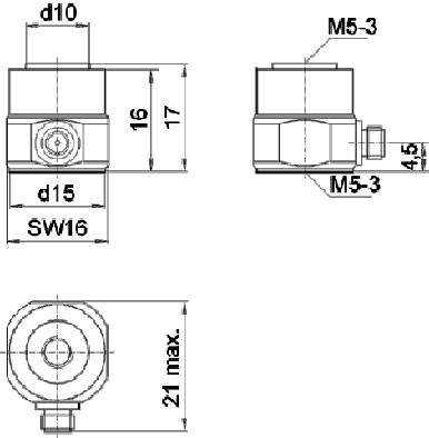 The KF24 operates effectively within a temperature range of -10°C to 80°C and is lightweight at 20 grams without the cable. The coupling mass is 5 grams, and it is encased in stainless steel for durability and resistance to environmental factors. The transducer offers radial connector direction with a standard UNF10-32 connector and includes options for mounting with 2 x M5.