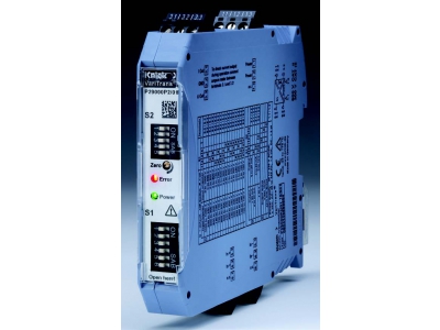 In addition to the primary selectable current or voltage outputs, a 2nd current output allows for connection to another device, such as a PLC. LEDs on the front indicate proper functioning or possible fault conditions, such as exceeding of the allowable load voltage at the output.