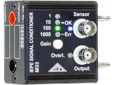 The IEPE Signal Conditioner M33 is tailored for dynamic measurements utilizing IEPE transducers in applications that require high precision such as acceleration, force, pressure, or sound. This device is ideal for multichannel systems in both industrial and field settings due to its compact design and wide voltage supply range.