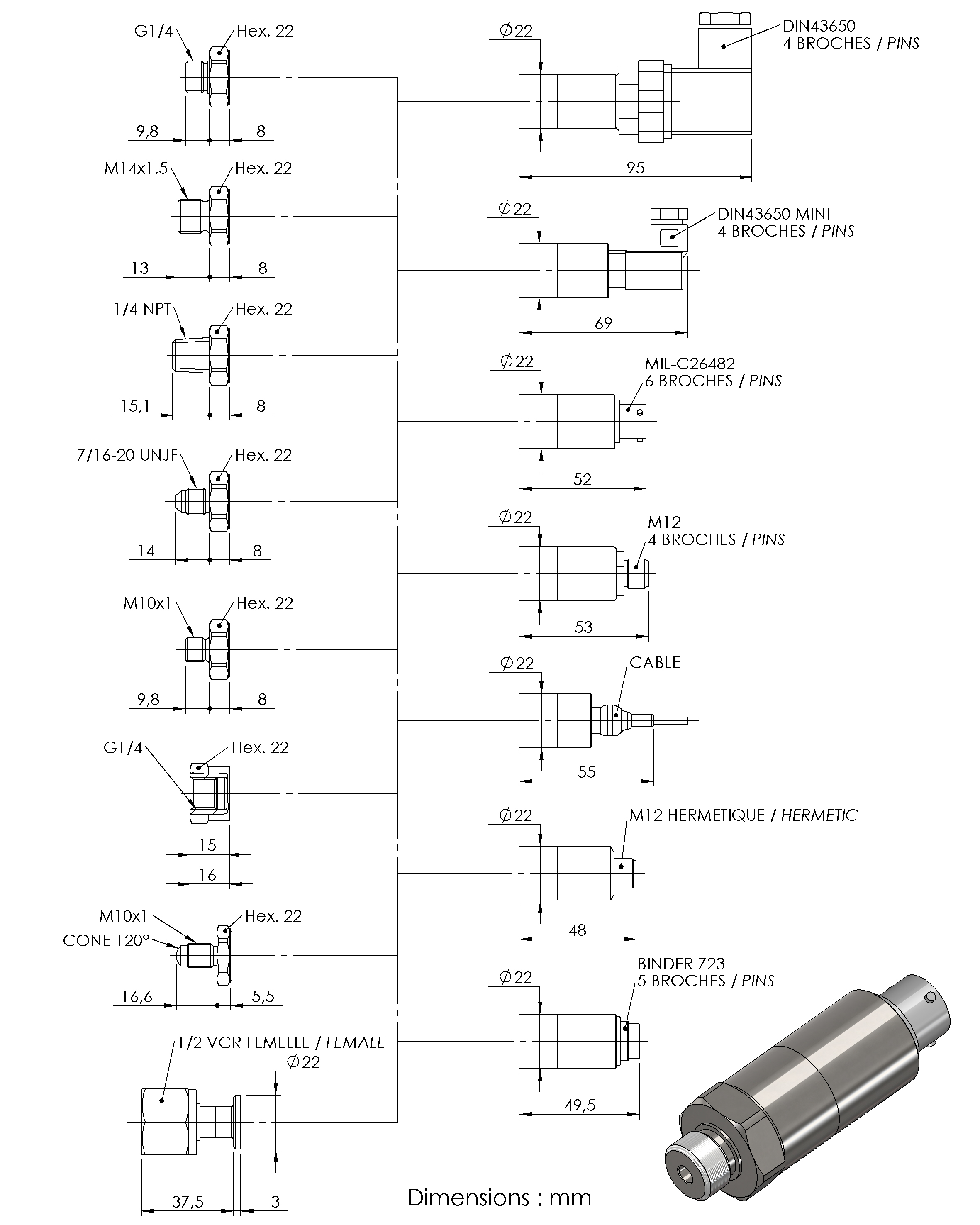 The PGP220 series are designed for high accuracy pressure measurements, from -1 up to 600bar and above on request. The sensing element is an advanced piezo-resistive pressure module which together with the latest temperature compensation techniques provides high performance measurements. It is available with low (millivolt) or high level (Vdc, mA) outputs. In the case of transducers, the built-in electronic ensures a correction of the pressure element while delivering an analogue output. Specified at 1kHz @-3dB (higher on request), signal‘s bandwidth is not affected by these corrections. Wetted parts being all stainless steel, the sensor is compatible with most media used in Industry, even corrosive ones. High accuracy pressure measurements on test benches, is one of the main application for the PGP220 series.