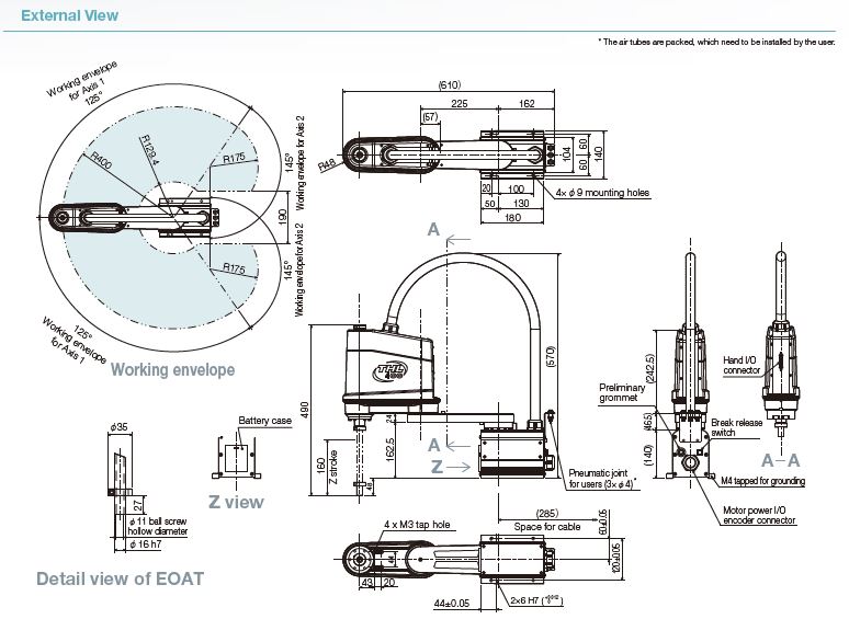 Toshiba's THL400 Robot features an arm length of 400mm and payload mass of 5kg. It also features an envelope of 4 axes, a Z-axis rotation of 360 degrees, and max speed of 6.3m/s.