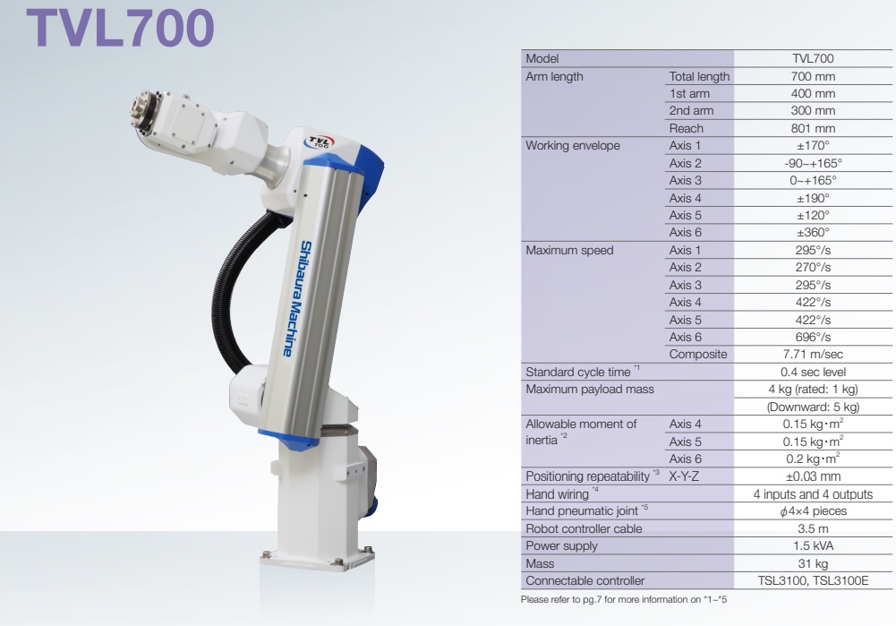 The Shibaura TVL700 Robot with a reach of 700mm and a payload of 4kg really packs a punch as it delivers a high speed, highly accurate energy saving performance at a low cost. It also saves on space delivering all of the functionality that you would insist on from a Six-Axis Robot, but with a fraction of the expected foot-print within your production line.