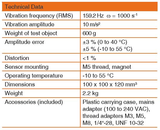 The basic model VC20 generates a fixed amplitude of 10 m/s² (RMS) at 159.2 Hz. This frequency was chosen because it corresponds to a radian frequency of 1000 s-1 where the following relationship exists for sine-wave signals: