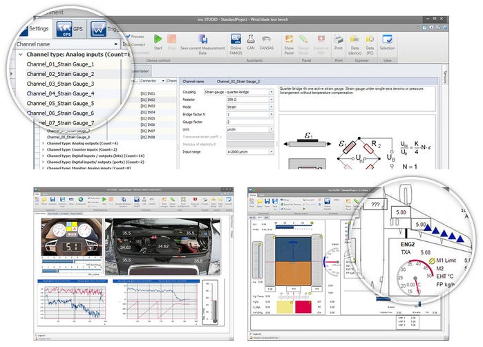 From the configuration of your measurement devices for quick data acquisition to fully automated test stands, imc STUDIO addresses all aspects of advanced testing. Together with the imc hardware, imc STUDIO captures, processes and visualizes analog and digital signals. Furthermore, it handles control tasks and integrates video and audio, as well as automation and simulation environments. One particular advantage of the software is its capability to be tailored to different users with their specific needs and levels of experience