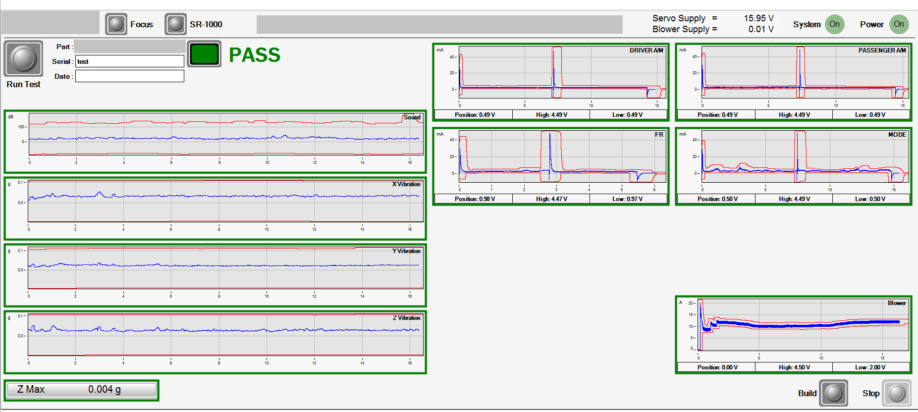 HVAC Graphical Display shown, up to 6 Servo currents, Blower current, Sound & Vibration.