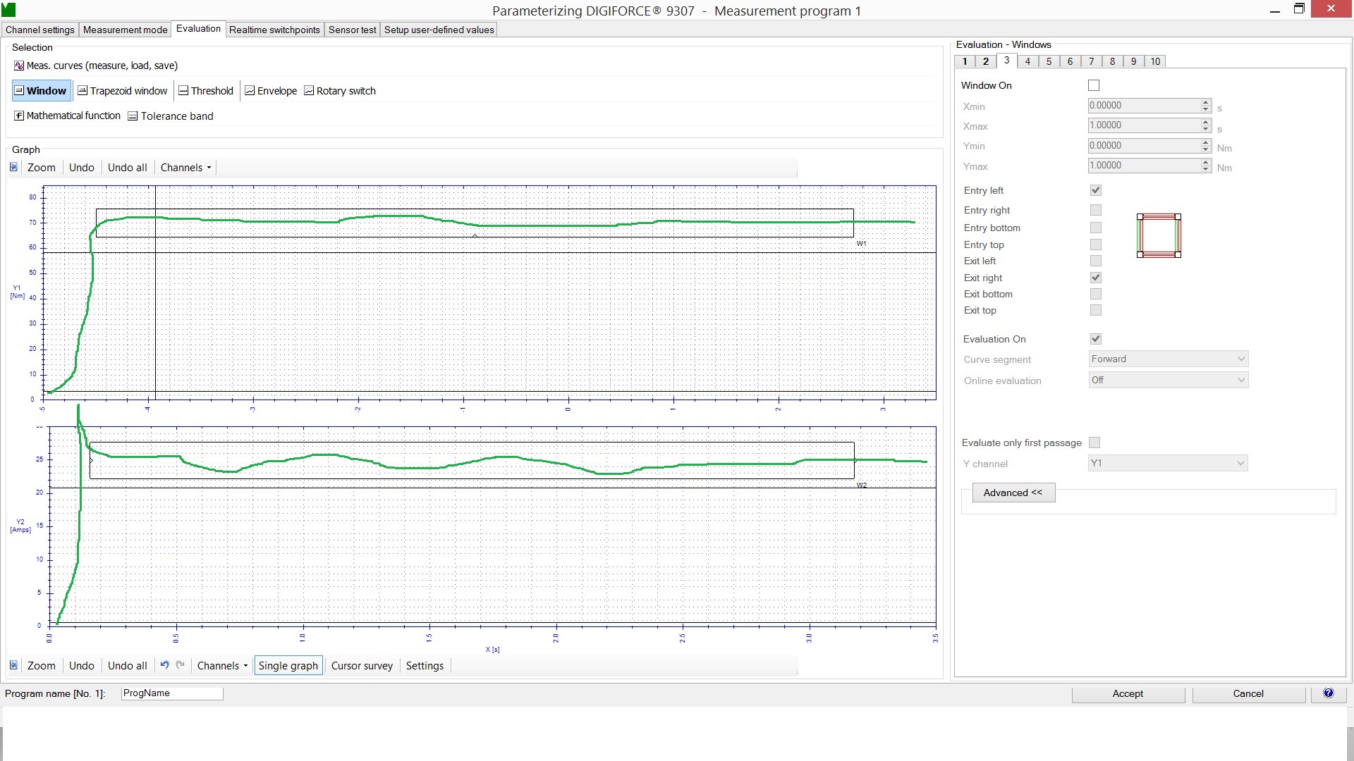 The Burster Digiforce 9307 is a full featured analysis system that goes beyond standard X vs. Y signature analysis with tolerance bands and windows.