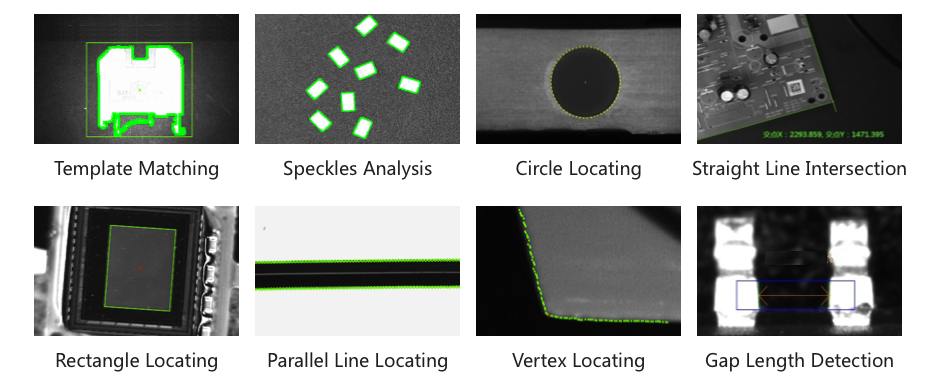 Positioning & Geometric Analysis: Advanced geometric feature detection for locating edges, circles, lines, and vertices. Includes robotic alignment tools and position correction for high-speed automation.